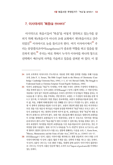 지금까지 신약의 “복음”은 크나큰 의미를 지닌 단어이고 신학적으로 중요한 표현으로서 사도들에 의해 사용되어 예수님에 관한 자 신들의 선포된 메시지를 요약하고 있다는 점을 살펴보았다. “복음” 은 케리그마 또는 선포이다. 우리는 여전히 이 단어를 오늘날 이런 식으로 사용하고 있는데, 예를 들어, 우리가 “복음을 전하는 것”에 대해 이야기할 경우가 그렇다. 물론 사도들이 의미했던 것보다는 보 다 협의의 의미로 종종 그렇게 말하지만 말이다. -35p-