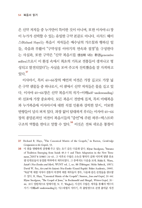 복음서 이야기들이 지닌 본질상 역사적인 진실성과 동시에 이 이 야기들이 “증언”하고 있는 실제 역사의 중요성을 확언하는 반면, 우리는 이론적으로나 실제적으로나 본문을 본문-이면에 있는 사건들에 대한 우리의 재구성으로 대체해서는 안 되며, 또한 이러한 재구성을 본문 읽기의 마지막 목표로 삼아서도 안 된다. 복음서들 자체의 “증언” 외에 본문-이면의 사건들을 접할 수 있는 방법은 전혀 없으며, 열광적으로 이런 사건 자료들을 찾는 것은 정경복음서들과 영감 된 복음서들, 즉 이런 사건들에 대한 “증언”인 복음서들이 분명 가지 고 있는 바를 부인하는 것이다. -346p-