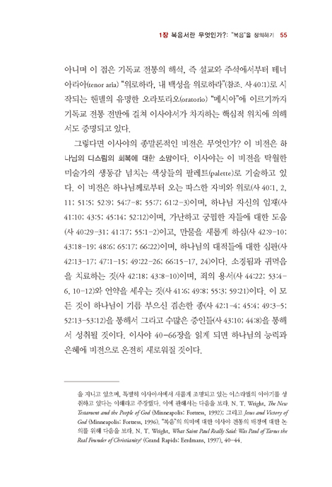 우리가 앞서 “복음”의 의미에 대한 설명 중에 주목했던 것처럼 예수님은 복음서들에서 모든 것들을 회복하리는 이사야 선지자의 약속에 대한 성취로 제시되고 있다(특별히 눅 4장에 나오는 사 61장을 보 라). 이 약속은 새로운 언약 관계와 죄의 용서에 관한 약속일뿐만 아 니라, 이와 밀접하게 연관되어 있지만 깨어진 것을 싸매고 비뚤어진 것을 바르게 하며, 모든 질병을 치유하겠다는 약속이다. 예수님은 셀 수 없이 많은 이러한 치유와 회복을 행하셨다. 그것은 단지 예수님이 자비롭기 때문이거나 변호적으로 자신이 정말 하나님께로부터 보내진 특별한 분이라는 점을 증명하기 위한 이유 때문만은 아니다. 그것은 기본적으로 치유와 회복의 사건들이 다가올 약속된 왕국을 보여 주는 묘사들이다. 예수님의 치유와 회복의 사역들은 곧 다가오는 예기된 추수 감사절 성찬에 앞서 부엌에서 잘 삶아진 한 조각의 칠면조 가슴살을 어머니가 은밀히 선물로 미리 입에 넣어 주시는 것 과 같다. -117p-