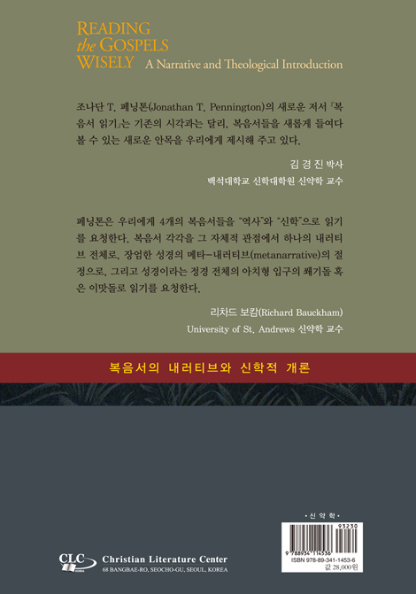 복음서들을 읽는다는 것이 미묘하고도 까다로운 작업이지만, 복음서들의 신학이 지닌 온전한 가치를 알고 복음서들을 읽는다는 것 은 중요하다. 조나단 T. 페닝톤(Jonathan T. Pennington)의 저작은 본 서를 읽는 사람들이 복음서들의 신학이 지닌 이러한 온전한 가치를 아는 일에 잘 이르도록, 동시에 지혜롭게 이르도록 도와준다.
