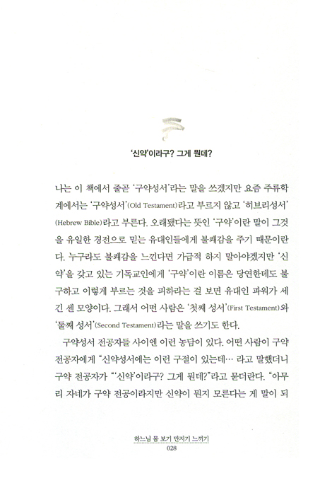 이 책은 구약성서의 무늬, 히브리적 사유의 본질, 고대 이스라엘 종교적 인식의 근간을 보여준다는 점에서, 그리고 물질성, 특히 신의 “몸”을 연구주제로 삼았다는 점에서 나를 감동케 했다. 대다수 사람들이 이 책을 처음 접하게 되면 당혹스런 느낌을 받을 것이라 예상해 본다. 그렇지만 이 책의 내용에 점점 빠져들면, 이스라엘 사람들이 하느님을 어떻게 경험하고 어떻게 생각했는지, 그리고 험난한 삶의 격랑 속에서 하느님을 어떻게 믿었는지를 알기 위해 구석구석 찾아가는 진지하고 흥겨운 신앙탐구의 여정임을 알 수 있을 것이다. 그리하여 이 책을 읽다보면, 자연스럽게 구약성서가 어떤 책인지, 구약성서의 신앙, 이스라엘 사람들의 종교의식 등에 대해서도 더불어 알게 되는 기쁨을 맛볼 것이다. 여러분을 이 열정적인 신앙탐사 여행길에 초대한다. 여행길에 함께 하실 우리 하느님도 기뻐하실 것이다. 어쩌면 만면에 웃음을 띤 하느님이 저자 등을 슬쩍 치시면서, “댓끼 이놈!” 이러실 것만 같다.
