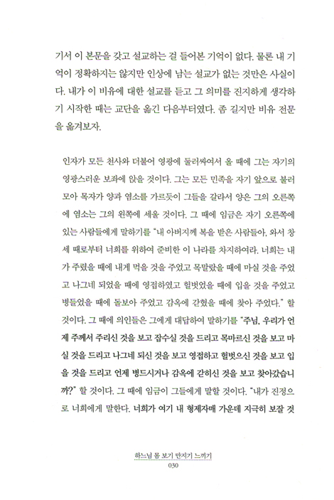 이 책은 이상의 내용을 구약과 신약성서의 여러 구절들을 해석해나가면서 설득력 있게 보여주고 있다. 그래서 이 책은 기독교 신앙을 현실세계와는 분리되어 저 세상만 바라보는 것으로 보는 오해와 일상의 삶을 떠나서 이른바 영적인 세계만을 추구하는 것으로 보는 오류를 교정하는 데 도움이 될 것이다. 이 책은 기독교 신자들이 접하기 어려운 신학적 내용들을 알기 쉽게 풀어서 보여줄 뿐 아니라 그것이 지금 여기의 현실과 어떤 관련성을 갖는지를 잘 보여주고 있다.