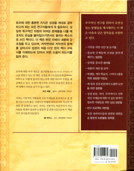 토라에 대한 충분한 지식은 성경을 제대로 공부하고자 하는 모든 연구자들에게 꼭 필요하다. 상당히 학구적인 차원의 어려운 문제들을 다룰 때 조차도 관심을 불러일으키면서도 끌리는 목소리로 쓰인 책이다. 이 책은 본문 자체의 내용에 강조점을 두고 있으며, 저작연대와 저작권의 문제를 넘어서서 성경의 처음 다섯 권의 책이 구속사를 이해하는데 있어서 어떤 도움이 되는지를 알려준다.