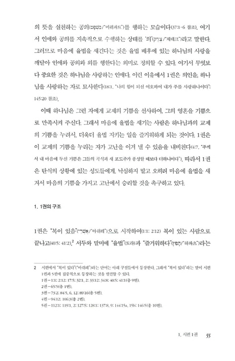 이 책은 구성적 접근이라는 최근의 시편 연구 방법론을 적용하고 집대성한 대단한 작품이다. 기존의 시편 연구가 숲은 보지 않고 나무만 주목함으로써 시편의 앞뒤 시와의 관련성에는 소홀했던 것에 반해, 이 책은 시편 전체가 통일성을 이룬 의도된 작품임을 전제하고 시편 전체를 거시적으로 살핀다. 시편을 한 권의 책으로 간주해 시편 전체를 탐구한 한국인 최초의 연구이자 시편 이해의 새로운 길을 밝혀 줄 이 책을 소홀히 하는 것은 보물 같은 시편 연구서를 놓치는 것이다.