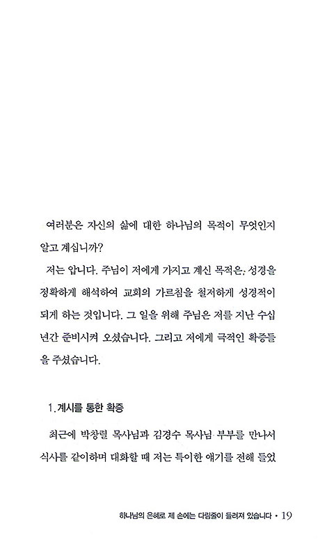 제가 보기에 목사님에게는 교사의 은사가 목사의 은사보다 강합니다. 계시를 통한 가르침의 은사 또한 목사님에게 있습니다. 이 계시가 목사님의 영으로부터 나오는 것입니다. 이 계시적인 가르침은 사람들을 일깨워 새로운 열정을 깆게 합니다. 제가 보는 것은 목사님은 한 곳 이상의, 한 나라 이상으로의 부르심이 있습니다. 목사님이 가지신 것을 어느 한 곳에서 풀어 놓으시고 그 동일한 가르침을 또 다른 장소에서 풀어놓으셔야 합니다. 이 계시적인 가르침을 여러 곳에, 주님께서 보내시는 곳이라면 어느 곳이든지 가서 풀어 놓으셔야 합니다.