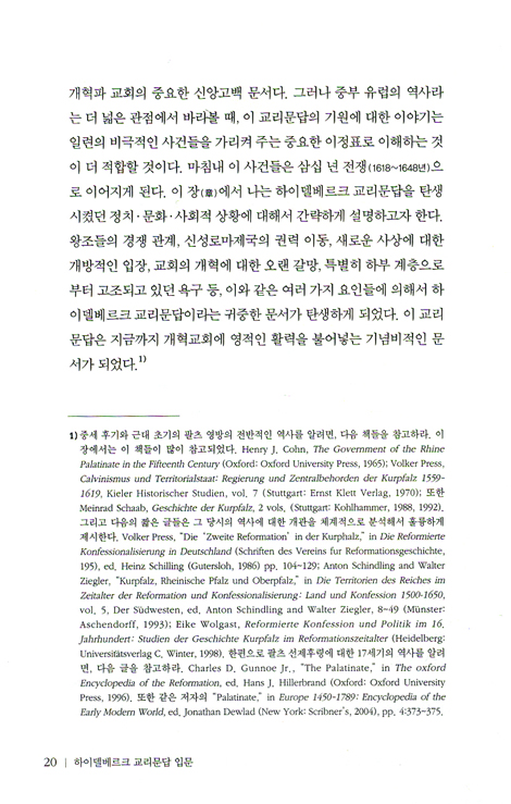 1부의 2장에서 몇 단락의 내용은 나의 다음 논문에 처음으로 출판되었다. “올레비아누스와 하이델베르크 교리문답의 저자 문제: 또 다른 견해” The Sixteenth Century Journal 13, no. 4 (1982): 17~27. 또한 프레드 그레이엄이 편집한 Later Calvinism: International Perspectives (Kirksville, Mo.: Sixteens Century Journal Publishers, 1994, 289~309)에서 나의 논문 「확실한 기초와 하이델베르크 교리문답의 기원」(“Vester Grundt and the Origins of the Heidelberg Catechism”)에 실렸었다. 해당 출판사의 허락을 얻어서 나는 여기에 그 논문들의 일부 내용을 다시 실었다.