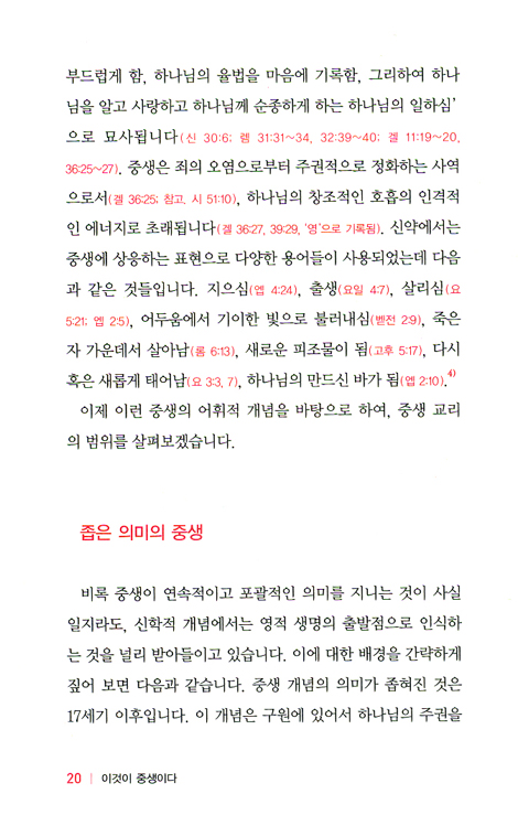 현 세대를 조망하는 신학자로서 패커 박사의 이런 권고는 적실(的實)하다고 생각합니다. 그러므로 마땅히 가르쳐야 하고 증거되어야 할 중생 교리가 다시 한번 이 세대 안에서 제 위치를 찾는 일에 조금이나마 기여하게 된다면 이 책은 소임을 다한 것입니다. 예정 교리가 그러하듯 중생 교리 역시 하나님의 주권을 드러내는 일에 있어서 핵심적인 교리임에 틀림없습니다.