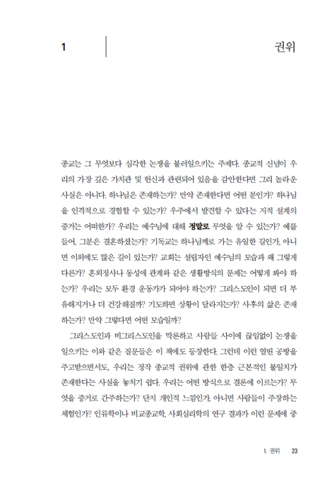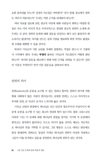 흔히 교리는 역동적인 믿음 생활과는 아무 관련 없는 고루하고 딱딱한 것, 혹은 더 이상 새로울 것 없는 뻔하디뻔한 정답처럼 여겨지기도 한다. 그러나 진지한 신자들이 칼뱅의 『기독교강요』나 웨스트민스터 신앙고백 등에 기울이는 관심에서 알 수 있듯, 기독교 교리는 성숙한 신앙의 핵심 요소다. 아무리 강력한 열심이나 신비한 경험도 성경으로 뒷받침되어야 비로소 기독교적이라 할 수 있는데, 진리를 가리고 미혹하는 이단들은 성경 구절을 짜깁기하여 왜곡을 일삼기 때문이다. 따라서 그리스도인으로서 올바로 살기 위해서는 성경을 그저 열심히 읽는 것만으로는 충분하지 않으며, 성경 전체의 가르침을 정리한 교리를 공부할 필요가 있다.