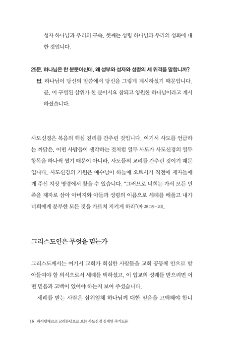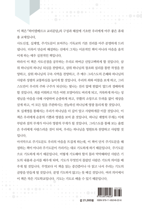 1. 이 책은 ‘하이델베르크 교리문답’을 기초로 사도신경, 십계명, 주기도문을 해설한 책입니다. 기존에 단권으로 나온 책들을 합본으로 묶었습니다.
