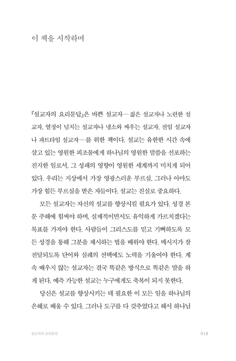 이 책은 설교자를 위한 요리문답이다. 이른바 전임 말씀 사역자를 대상으로 삼았다. 그러면서도 이제 막 사역을 시작한 사람이나 부르심을 검토하는 사람, 신학생, 설교의 은사는 있으나 목회의 부르심을 받지 않은 사람을 비롯한 전 범위의 설교자를 포괄한다. 모든 설교자는 설교를 향상시키는 데 필요한 일—성경 본문 주해, 단어와 실례 선택 등—을 배울 수 있다. 그러나 도구를 다 갖추었다고 해서 하나님의 마음에 맞는 설교자, 진정 듣는 이를 섬기는 설교자가 되는 것은 아니다. 하나님과 그분의 복음에 사로잡힌 마음과 정신이 더욱 필요하다. 이 책은 그 준비를 더 갖추게 하기 위한 시도다.