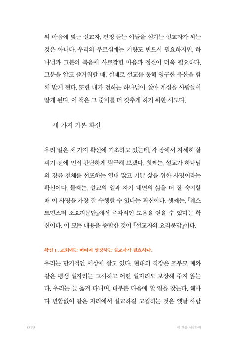 당신은 설교를 향상시키는 데 필요한 이 모든 일을 하나님의 은혜로 배울 수 있다. 그러나 도구를 다 갖추었다고 해서 하나님의 마음에 맞는 설교자, 진정 듣는 이들을 섬기는 설교자가 되는 것은 아니다. 우리의 부르심에는 기량도 반드시 필요하지만, 하나님과 그분의 복음에 사로잡힌 마음과 정신이 더욱 필요하다. 그분을 알고 즐거워할 때, 실제로 설교를 통해 영구한 유산을 함께 받게 된다. 또한 내가 전하는 하나님이 살아 계심을 사람들이 알게 된다. 이 책은 그 준비를 더 갖추게 하기 위한 시도다. 우리 일은 세 가지 확신에 기초하고 있는데, 각 장에서 자세히 살피기 전에 먼저 간단하게 탐구해 보겠다. 첫째는, 설교가 하나님의 경륜 전체를 선포하는 열매 많고 기쁜 삶을 위한 사명이라는 확신이다. 둘째는, 설교의 일과 자기 내면의 삶을 더 잘 숙지할 때 이 사명을 가장 잘 수행할 수 있다는 확신이다. 셋째는, 웨스트민스터 소요리문답 에서 즉각적인 도움을 얻을 수 있다는 확신이다. 이 모든 내용을 종합한 것이 『설교자의 요리문답』이다. _이 책을 시작하며, p.18-19