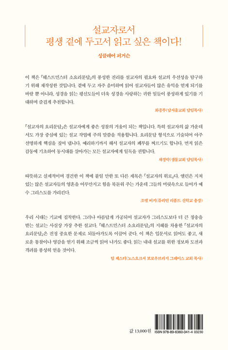 이 책은 『웨스트민스터 소요리문답』의 풍성한 진리를 설교자의 필요와 설교의 우선성을 탐구하기 위해 재작성된 것입니다. 곁에 두고 자주 음미하며 읽어 설교자들이 많은 유익을 얻게 되기를 바랄 뿐 아니라, 성경을 읽는 평신도들이 더욱 성경을 사랑하는 귀한 일들이 풍성하게 있기를 기대하며 즐겁게 추천합니다.