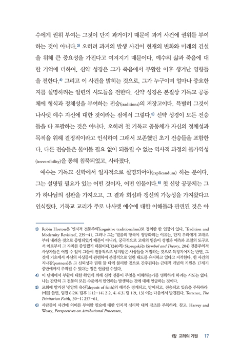 1) 기독교 전통의 교리적 유산에 대한 비평적 재접근은 아마도 이 시대의 신학이 직면한 가장 어려운 숙제 중 하나다.