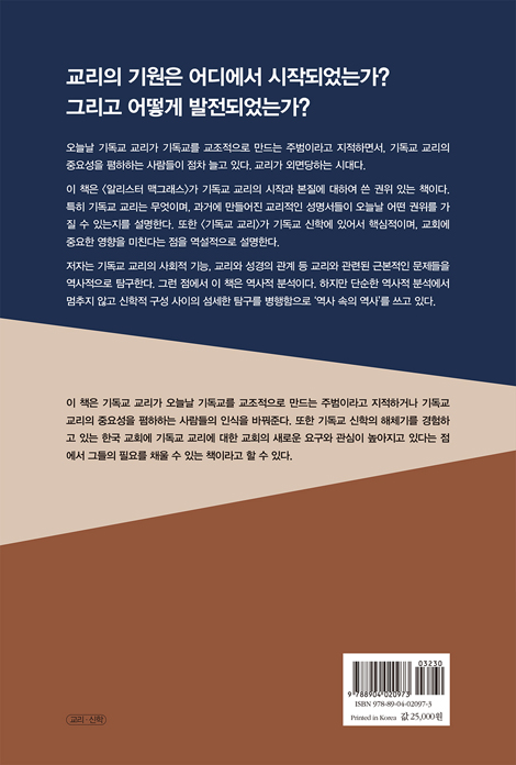 이 책은 <알리스터 맥그래스>가 기독교 교리의 시작과 본질에 대하여 쓴 권위 있는 책이다. 특히 기독교 교리는 무엇이며, 과거에 만들어진 교리적인 성명서들이 오늘날 어떤 권위를 가질 수 있는지를 설명한다. 또한 <기독교 교리>가 기독교 신학에 있어서 핵심적이며, 교회에 중요한 영향을 미친다는 점을 역설적으로 설명한다.