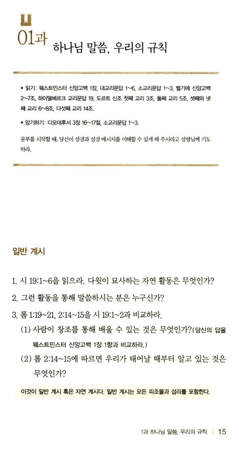이 책의 첫 부분은 학생용 교재입니다. 학생은 공책을 마련해서 거기에 답을 기록해야 할 것입니다. 교사용 지침 부분에는 각각의 질문에 간략한 답과 설명을 위한 제언을 수록합니다. 학생은 예습할 때, 우선 웨스트민스터 표준 문서(웨스트민스터 신앙고백, 웨스트민스터 대요리문답, 웨스트민스터 소요리문답)나 세 가지 일치 신조(벨기에 신앙고백, 하이델베르크 신앙고백, 도르트 신조)의 지정된 항목을 읽어야 합니다. 그러고 나서 그 주제 관련 성경 공부를 합니다. 그렇게 하면 한 시간 반에서 두 시간 내에 한 과를 마칠 수 있습니다. 학생은 암기 숙제를 하면서 기본 성구와 소요리문답 부분을 외울 수 있습니다(적절한 질문과 답을 하이델베르크 요리문답에서 찾아 대체해도 됩니다).