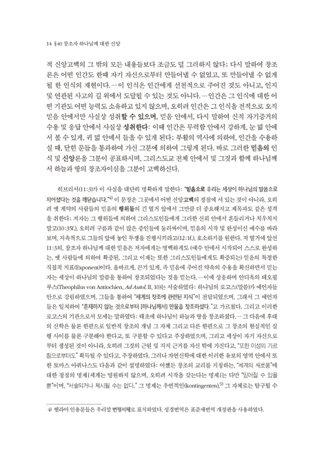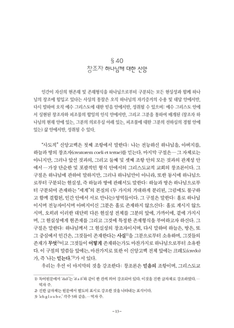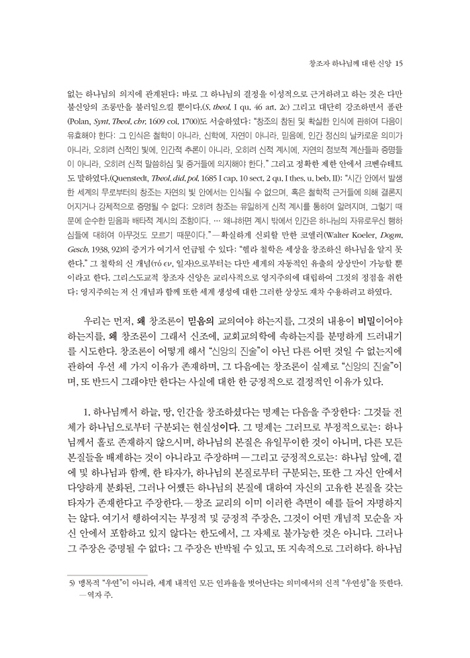 생각으로 ‘교리학’이 아닌 ‘교의학’을 집필했다고 한다. 바르트의 『교회교의학』 은 원래 총 5부로 계획됐었다. 그러나 ‘구원론·종말론’에 할당된 마지막 부분은 집필되지 않았다. 현재의 13권은 ‘서론’(1부 1, 2권), ‘하나님론’(2부 1, 2권), ‘창조론’(3부 1, 2, 3, 4권), ‘그리스도론·화해론’(4부 1, 2, 3.1, 3.2권)으로 이뤄져 있다. 4부의 4권은 교회윤리에 해당하는 세례론과 성만찬론을 위주로 설계되었으 나 세례론만을 다룬 채 미완성으로 남아있다. ‘창조에 관한 교의 제1권’은 신앙론으로서 창조론에 대해 말하며, 그 안에서 신과 인간과 세계의 관계를 정교한 주석작업