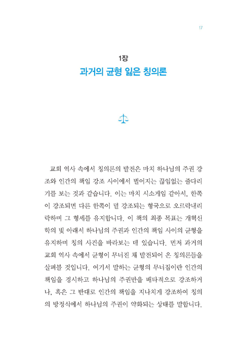 저자는 이 책에서 하나님의 주권과 인간의 역할 사이의 균형이란 시각으로 칭의론을 다룬다. 균형 잡기에 실패한 과거의 칭의론을 살펴보고 현대의 칭의론 논쟁도 유사한 실패의 늪에서 허덕이고 있음을 지적한 후, 균형 잡힌 칭의론의 본보기로 바빙크와 비치우스의 칭의론을 소개한다. 다소 복잡하고 난해한 주제를 학문적 객관성의 희생 없이도 명료한 표현과 간결한 문장과 부드러운 경어체에 잘 담아냈다. 저자의 노고로 칭의론 이해의 지평이 넓어질 듯하여 감사하다.