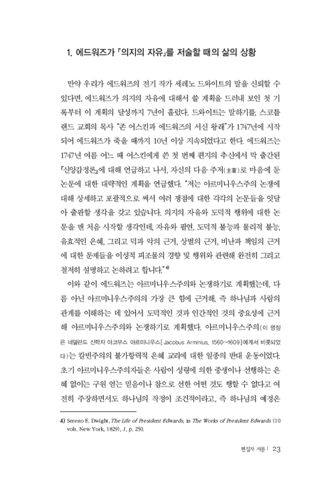 조나단 에드워즈는 교회사가 배출한 인물 가운데 성경 지식과 성령 체험, 신학 이론과 생활 실천, 냉철한 지성과 뜨거운 감정이 가장 탁월하게 균형 잡힌 인물 중 하나다. 부흥과개혁사는 역사적으로나 신학적으로 가장 광범위하고 신뢰할 수 있는 예일 대학교 출판부의 <조나단 에드워즈 전집>을 2005년에 『신앙감정론』과 함께 국내에 소개하기 시작했는데, 2016년에는 『원죄론』에 이어 『의지의 자유』를 출간했다.