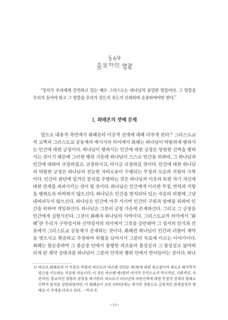 총 13권으로 구성돼 있는 『교회교의학』은 바르트의 가장 핵심적인 저서이자 신학적 가치가 매우 뛰어난 작품이다. 바르트는 신학이 신학자들이나 철학자들의 논쟁 대상이 아니라 교회를 위해 실제로 적용될 수 있어야 한다는 생각으로 ‘교리학’이 아닌 ‘교의학’을 집필했다고 한다. 바르트의 『교회교의학』은 원래 총 5부로 계획됐었다. 그러나 ‘구원론·종말론’에 할당된 마지막 부분은 집필되지 않았다. 현 13권은 ‘서론’(1부 1, 2권), ‘하나님론’(2부 1, 2권), ‘창조론’(3부 1, 2, 3, 4권), ‘그리스도론·화해론’(4부 1, 2, 3.1, 3.2권)으로 이뤄져 있다. 4부의 4권은 교회윤리에 해당하는 세례론과 성만찬론을 위주로 설계되었으나 세례론만을 다룬 채 미완성으로 남아있다.‘화해론’(Die Lehre von Versoehnung, 1953-1967)에서는 창조와 죄에 대한 논의, 화해 및 구속자의 인격과 행위에 언급되는 전통적 화해론을 다루고 있다. 본권은 ‘그리스도론·화해론’의 제3권 1부에 해당하는 것이다.