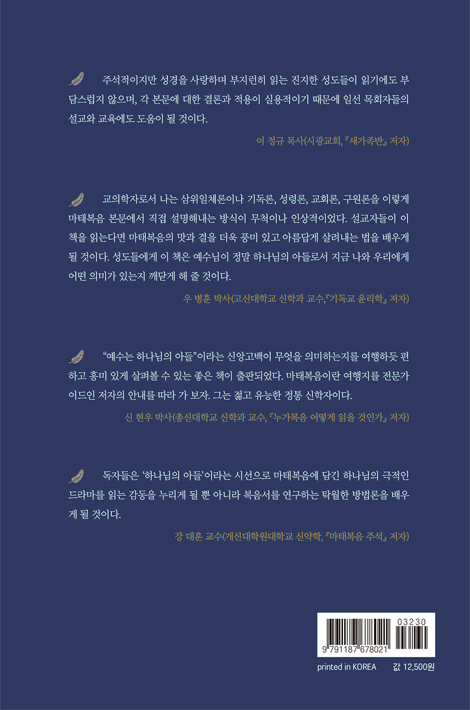저자의 안내를 따라서 “하나님의 아들” 주제를 파악하는 ‘마태복음 여행’을 떠나 봅시다. 여행을 마칠 때쯤이면 “이는 내 사랑하는 아들이다” 하신 하나님 아버지의 말씀을 충분히 깨닫게 될 겁니다.