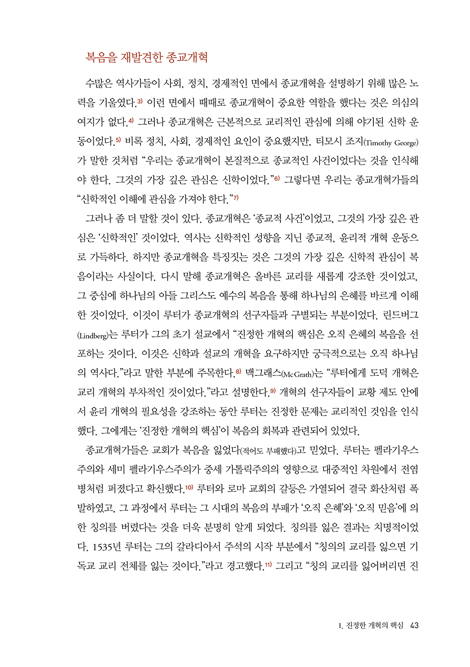 수많은 역사가들이 사회, 정치, 경제적인 면에서 종교개혁을 설명하기 위해 많은 노력을 기울였다. 비록 정치, 사회, 경제적인 요인이 중요했지만, 종교개혁은 근본적으로 교리적인 관심에 의해 야기된 신학 운동이었다. 종교개혁을 특징짓는 것은 그것의 가장 깊은 신학적 관심이 복음이라는 사실이다. 다시 말해 종교개혁은 올바른 교리를 새롭게 강조한 것이었고, 그 중심에 하나님의 아들 그리스도 예수의 복음을 통해 하나님의 은혜를 바르게 이해한 것이었다. 이것이 루터가 종교개혁의 선구자들과 구별되는 부분이었다. 개혁의 선구자들이 교황 제도 안에서 윤리 개혁의 필요성을 강조하는 동안 루터는 진정한 문제는 교리적인 것임을 인식했다. 그에게는 ‘진정한 개혁의 핵심’이 복음의 회복과 관련되어 있었다.