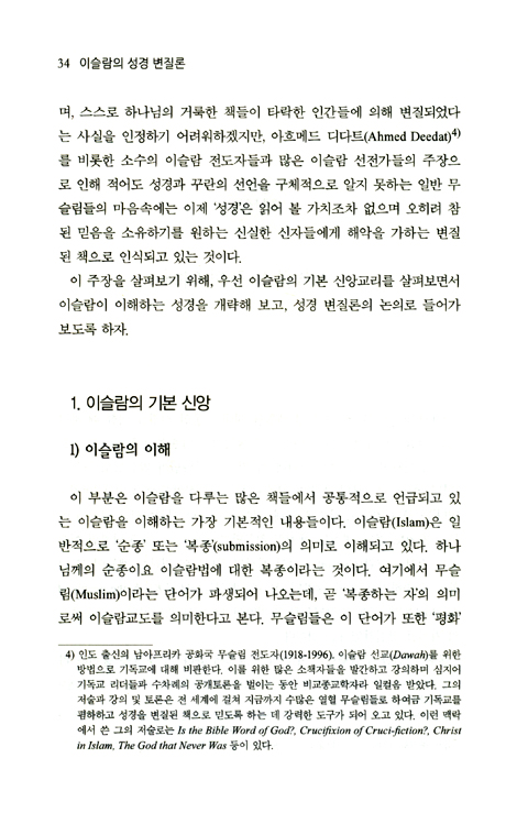 불항하게도 이슬람은 유대교와 기독교에서 차용한 종교이다. 그럼에도 불구하고 ‘뒤의 계시가 앞의 계시를 능가하거나 무효화 한다’면서 이전의 두 종교를 완전히 부정한다. 그렇게 함으로써 성경은 이슬람에 의해 심하게 왜곡된 채 인식되고 만다…이 주장이 지니고 있는 한계들과 모순들을 경전적인 입장에서 뿐만 아니라 다양한 이론적 근거를 들어 낱낱이 밝혀내고 있다.