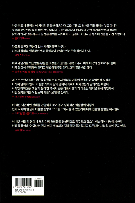 나는 루터가 아니다. 그래서 문에 내걸어 놓을 95개 반박문도 없다. 오직 다섯 가지 수정안이 있을 뿐이다. 이는 지하드와 파괴를 설교하고 주장하는 사람들이 대단히 성공적으로 활용한 이슬람 신앙의 다섯 가지 근본 교리와도 관계가 있다. 종교에서 근본 교리를 개정하는 것이 얼마나 어려운 일인지 잘 안다. 하지만 이슬람교가 현대성과 조화를 이루기 위해서는, 어느 때보다 서로 간의 관계가 긴밀해진 지구상에서 무슬림 국가들이 다른 나라와 공존하기 위해서는, 특히 수많은 무슬림들이 서구 사회에서 번영과 행복을 누리기 위해서는 다섯 가지 교리가 마땅히 수정되어야 한다. 다름 아닌 이성과 양심이 그 일을 요구하고 있다. 이런 변화는 진정한 이슬람 개혁의 토대가 될 것이라고 나는 믿는다. 이는 7세기로 퇴보하기보다는 21세기로 진보하기 위한 유일한 길이다. _p.110-111