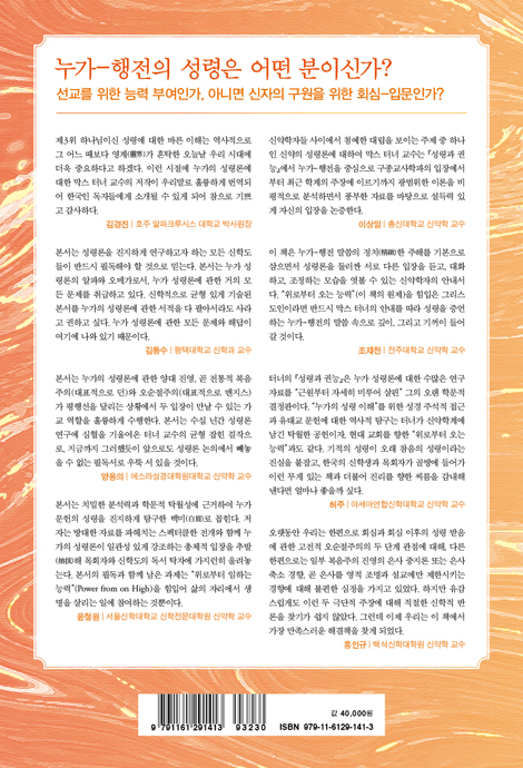 이런 차에 성령론에 관한 ‘결정판’이라 할 수 있는 저서가 드디어 우리말로 나왔다. 본서의 저자인 막스 터너는 현재 국제적으로 가장 널리 인정받는 성령론 전문가다. 그의 탁월한 학문적 성취가 우리말로 번역되어 나온 것 자체가 한국 신학계를 위한 귀중한 선물이라 할 수 있을 것이다.