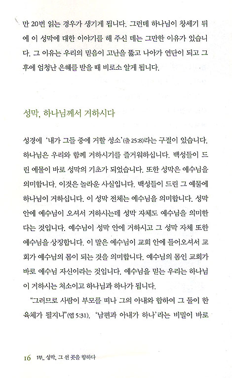 성막을 공부하면서 크신 하나님의 지혜를 경험하고, 하나님의 비밀이신 사랑과 은혜의 예수님을 만나고, 주님의 교회가 어더한 것인지를 다시 깨닫고, 주님께서 원하시고 기뻐하시는 나의 신앙생활은 어떠한 것인가, 어떻게 신앙생활을 하는 것이 주님께서 성도를 향한 디자인인가를 발견하는 우리 모두가 되기를 바라는 마음 간절합니다.