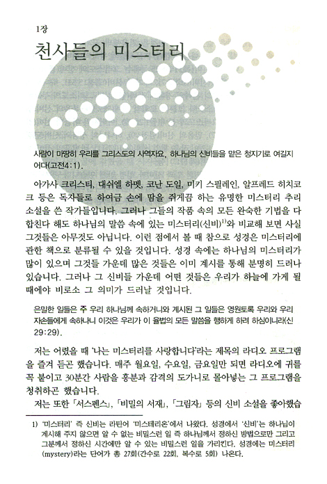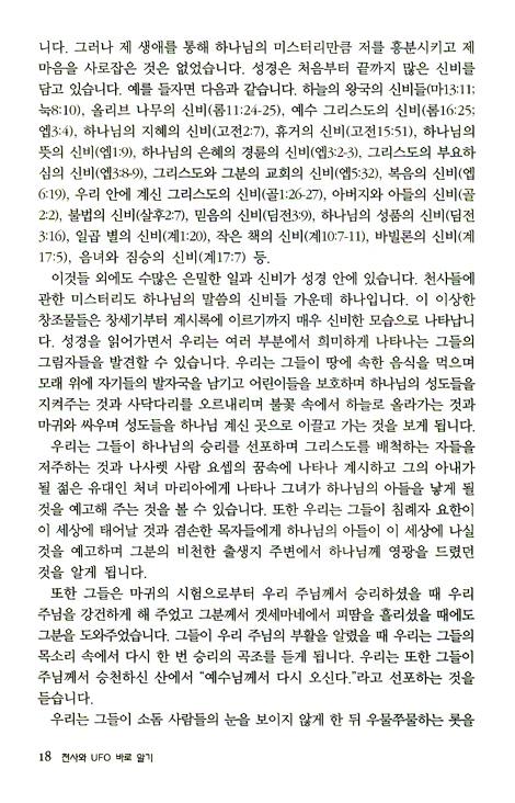 이제 여러분은 이 같은 연구 결과를 담은 책을 보고 있습니다. 「천사의 미스터리」(Mystery of The Angels)라는 제목의 이 책은 이렇게 매혹적이고 신비로운 창조물을 주제로 해서 여러 해 동안 연구한 결과의 산물입니다. 이 신비한 존재는 힘에 있어서 이 땅의 어떤 존재보다 월등하며 지혜는 우리 인간의 이해를 초월합니다.