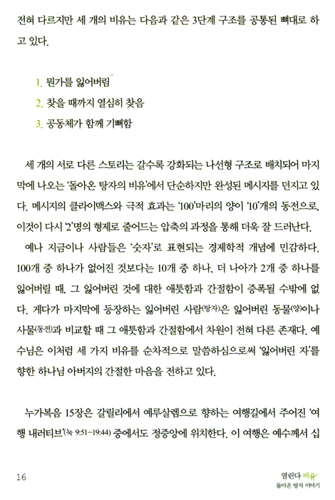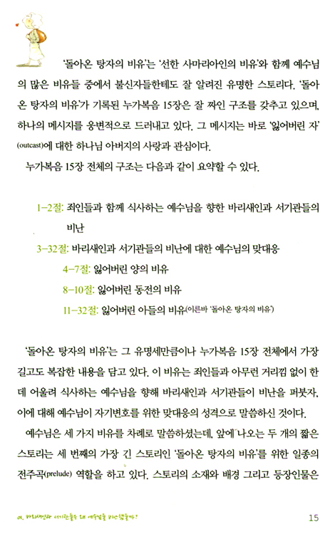 이 비유가 탄생한 상황과 목적 그리고 교훈 등을 종합적으로 고려해 볼 때 오히려 ‘사랑이 많은 아버지와 잃어버린 두 아들의 비유’란 제목이 더 타당하지 않을까 싶다. 지금부터 우리는 잃어버린 두 탕자를 향해 두 팔을 벌리고 사랑하고 용서하는 아버지를 만나러 가는 여정을 출발하고자 한다. p. 51-5