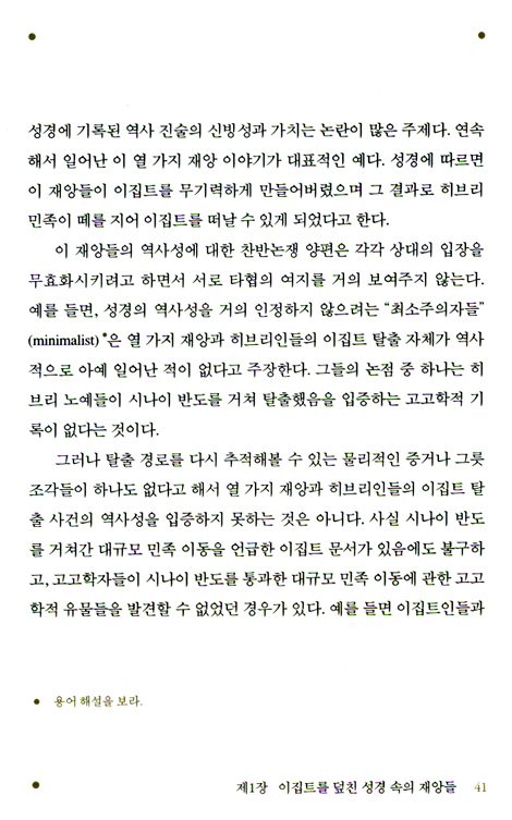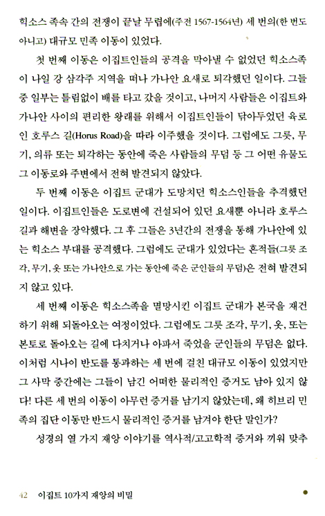 성서학자들에게 이 책은 구약성서가 고백하는 성서적 역사의 역사성 연구에 초석을 놓았던 윌리엄 올브라이트 박사의 세계로 새삼 들어서게 한다. 아니, 그보다 훨씬 더 극적으로 출애굽기 7-13장의 사건과 실제로 병행하는 역사적 재앙을 과학자의 시각으로 소개하면서, 전승이라는 이름으로 보존되어온 구약의 기사를 신화가 아닌 역사로 볼 수 있는 토대를 제공하고 있다.