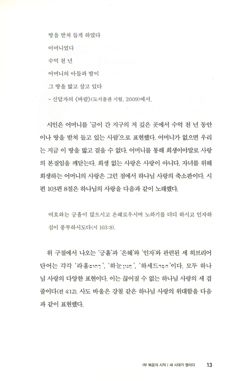 그래서 저자는 성서의 인물들을 과거에 묶어 두지 않고 그들의 삶 속에 축적된 소중한 신앙적 유산을 얻고자 한다. 그 유산 가운데는 우리를 속속들이 비추는 영혼의 거울이 있다. 그 거울에 비친 나의 모습에 절망하기도 하고, 인간 역사 속에 깊이 뿌리내린 악의 실체에 전율하기도 하면서, 그 역사의 현장에서 희망과 구원의 싹을 틔우시는 하나님을 만나게 되는 것도 성서의 인물들이 남긴 영혼의 거울을 통해서다.