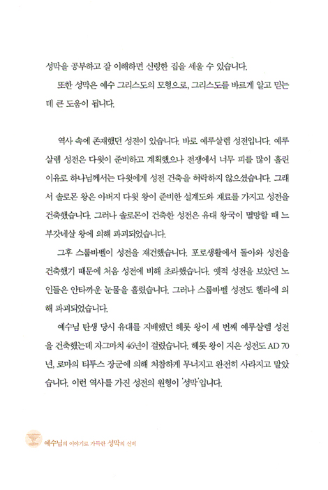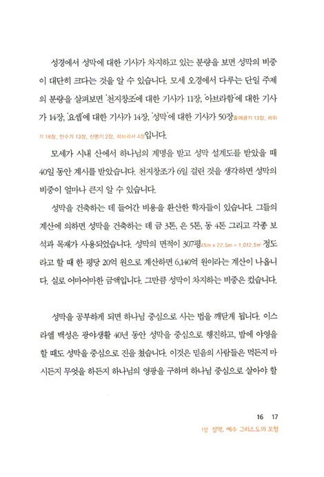 하나님은 이를 지키기 못하는 인간들을 위해 대속죄일을 정해 놓고 일 년에 한 번 대제사장이 들어가 속죄소에 피를 뿌리면 그 피로 인해 죄를 사해주셨습니다. 심판의 자리가 이 피로 인해 은혜의 자리가 되었습니다. 매년 드려야 했던 동물의 피 대신 예수님께서 피를 흘리심으로 한 번에 우리의 죄가 사해졌습니다. 그때 지성소와 성소를 갈라놓았던 휘장이 찢어졌습니다. 하나님과 우리를 가로막고 있던 가림막이 예수님의 보혈로 사라지게 되었습니다. 그래서 성막은 예수님의 예표가 됩니다. _프롤로그에서