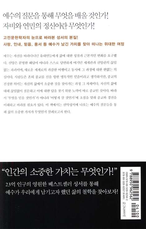 지난 13년 동안 서울대에서 유대교, 그리스도교, 이슬람교에 대한 강의를 비롯해, 그 종교들을 탄생시킨 고대 오리엔트 문명과 헬레니즘 문명을 가르친 배철현 교수는 우리가 몰랐던 예수의 정신과 우리 사회에 필요한 컴패션(compassion) 즉, 자비와 연민이라는 가치를 전하기 위해 ≪인간의 위대한 질문≫(21세기북스 펴냄)을 집필했다. 배철현 교수는 미국 하버드대에서 세계 최초로 셈족어와 인도-이란어 고전문헌학을 동시에 전공하여 박사학위를 취득했으며, 구약성서에 쓰인 히브리어와 아람어, 신약성서에 쓰인 그리스어를 비롯해 이와 관련된 다양한 고대 언어 문헌들을 성서 원전과 비교하여 연구해온 국내 유일무이한 고전문헌학자이다. 이 책은 성서 원전을 바탕으로 한 깊이 있는 해석과 언어학, 철학, 문학, 역사, 예술을 넘나드는 저자의 남다른 통찰력으로 성서를 보는 새로운 시각을 선사한다.