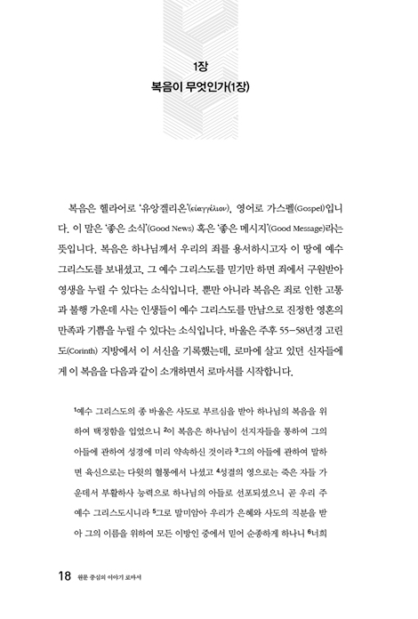 복음에 대한 보다 깊은 이해와 그 진리를 바탕으로 한 신앙생활에 있어서, 로마서만큼 깊고 풍부한 진리를 제공해 주는 책은 없을 것입니다. 이 글은 이러한 로마서 전체의 내용을 충실하게 원문 중심으로 이해할 수 있도록 도우면서, 동시에 신앙생활에 실제적인 적용이 가능하도록 다양한 소재들을 하나의 이야기 형식(narrative)으로 구성했습니다.