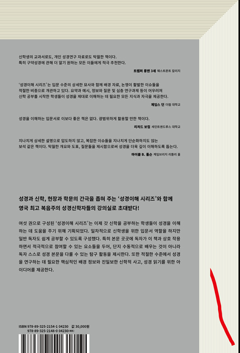 ‘성경이해 시리즈’는 입문 수준의 상세한 묘사와 함께 배경 자료, 논쟁이 활발한 이슈들을 적절한 비중으로 개관하고 있다. 요약과 예시, 정보와 질문 및 심층 연구과제 등이 어우러져 신학 공부를 시작한 학생들이 성경을 제대로 이해하는 데 필요한 모든 지식과 자극을 제공한다.