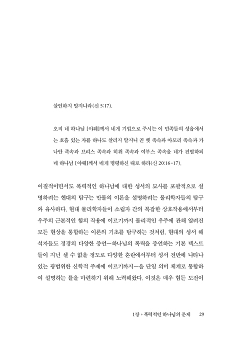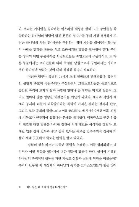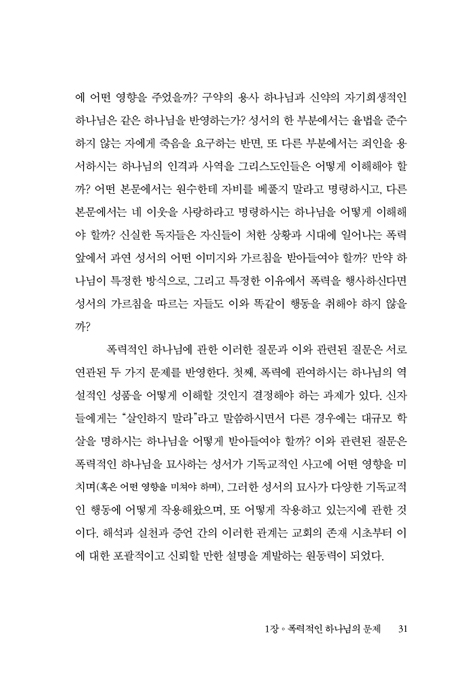 성서에 기록된 하나님의 폭력적인 행동은 과연 기독교 신앙과 실천에 영향을 미쳤을까? 폭력이 난무한 이 세상에서 하나님의 폭력은 그리스도인들의 행동 양식에 어떤 영향을 주었을까? 구약의 용사 하나님과 신약의 자기희생적인 하나님은 같은 하나님을 반영하는가? 성서의 한 부분에서는 율법을 준수하지 않는 자에게 죽음을 요구하는 반면, 또 다른 부분에서는 죄인을 용서하시는 하나님의 인격과 사역을 그리스도인들은 어떻게 이해해야 할까? 어떤 본문에서는 원수한테 자비를 베풀지 말라고 명령하시고, 다른 본문에서는 네 이웃을 사랑하라고 명령하시는 하나님을 어떻게 이해해야 할까? 신실한 독자들은 자신들이 처한 상황과 시대에 일어나는 폭력 앞에서 과연 성서의 어떤 이미지와 가르침을 받아들여야 할까? 만약 하나님이 특정한 방식으로, 그리고 특정한 이유에서 폭력을 행사하신다면 성서의 가르침을 따르는 자들도 이와 똑같이 행동을 취해야 하지 않을까?