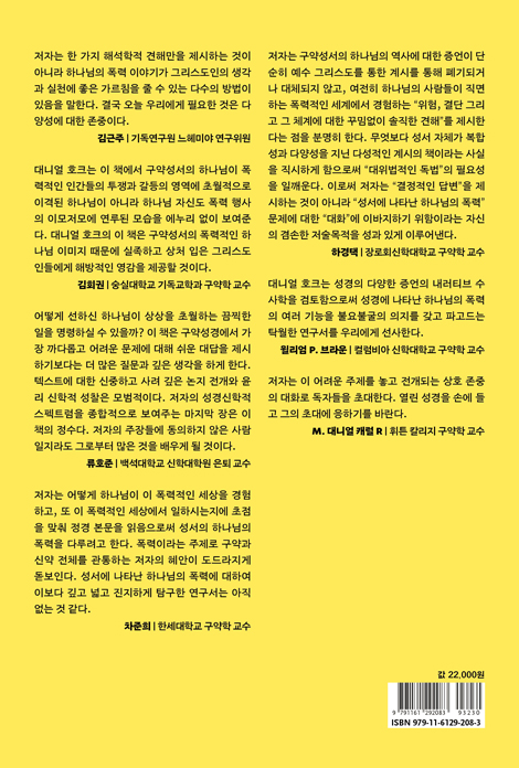 대니얼 호크는 이 책에서 구약성서의 하나님이 폭력적인 인간들의 투쟁과 갈등의 영역에 초월적으로 이격된 하나님이 아니라 하나님 자신도 폭력 행사의 이모저모에 연루된 모습을 에누리 없이 보여준다. 대니얼 호크의 이 책은 구약성서의 폭력적인 하나님 이미지 때문에 실족하고 상처 입은 그리스도인들에게 해방적인 영감을 제공할 것이다.