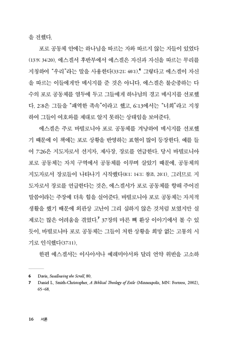 본서는 한국인 학자가 자세히 풀어 쓴 에스겔 주석서이다. 원전을 일대일로 읽고 주해한 책은 아닐지라도 에스겔서의 짜임새와 구조를 자세히 연구하여 에스겔서의 신학적 메시지를 잘 드러내고 있다. 저자는 에스겔서를 큰 단원으로 나눠 읽을 뿐만 아니라 각 장의 연결성을 잘 주목하고 에스겔서를 해석하고 있다. 본서는 에스겔서가 그동안 낯설었던 독자들에게는 친절한 안내서가 될 것이다. 세 가지 이유를 들어 이 책의 일독을 추천한다. 첫째, 이 책은 에스겔서의 개별 본문에 맞게 다양한 해석 방법을 활용하여 전체적으로 균형감각을 잘 유지하고 있다. 묵시록적인 비유와 난해한 난수표 같은 동물, 나무 메타포 등에 대해서는 당대의 역사적 의미 파악에 충실하면서도 그것이 가리키는 종말론적인 차원까지도 잘 다루고 있다. 둘째, 에스겔서를 아침에 큐티할 때 읽을 성도나 설교 본문으로 삼는 설교자 모두에게 유용한 본문 해석과 정보를 잘 제공하고 있다. 저자는 설교자적인 감정의 격앙을 전혀 의도하지 않으며 건조한 학술체를 유지하지만, 전체적인 해석에는 설교자들이 원용할 통찰이 여러 군데서 발견된다. 셋째, 에스겔서를 새 언약과 요한계시록의 종말론과 잘 연동시켜줌으로써 신앙의 책으로 에스겔서를 읽는 그리스도인들에게 위로와 소망을 안겨준다. 불건전하고 퇴폐적인 종말 열광주의자들이 무분별하게 취사선택하며 에스겔서를 농단하는 사태를 미연에 방지할 수 있는 건강한 신학이 본서의 에스겔 해석을 이끌고 있다.