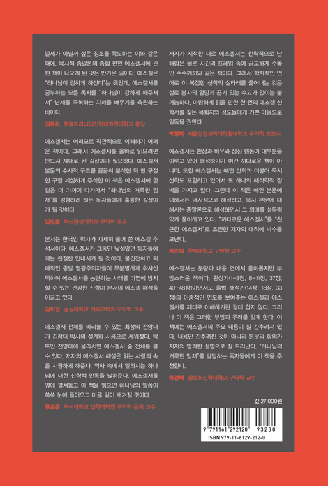 에스겔서는 여러모로 직관적으로 이해하기 어려운 책이다. 에스겔서 자체의 서술이 논리적 순서를 따르지 않을 뿐 아니라, 상징과 환상으로 가득 차 있어서 그렇다. 그래서 에스겔서를 올바로 읽으려면 반드시 제대로 된 길잡이가 필요하다. 예언서 최종 형태 본문의 구성에 지대한 관심을 가지고 풀어서 한국 신학계와 교계에 찬찬히 펴내는 일에 매진하고 있는 저자는 본서에서 이 에스겔서를 주석하였다. 벌써 저자는 전작인 이사야, 예레미야, 소예언서는 물론 시편 저서에서 본문 분석과 주석의 탁월함을 보여주었다. 이 책에서도 저자의 말대로 에스겔서의 문자적 해석과 상징적 해석을 병행하려는 노력을 여실히 체감할 수 있다. 에스겔서 본문의 수사적 구조를 꼼꼼히 분석한 뒤 한 구절 한 구절 세심하게 주석한 이 책은 에스겔서에 한 걸음 더 가까이 다가가서 “하나님의 거룩한 임재”를 경험하려 하는 독자들에게 훌륭한 길잡이가 될 것이다.