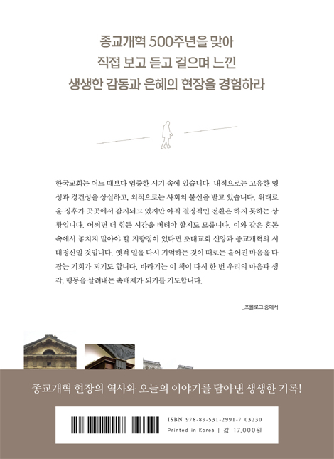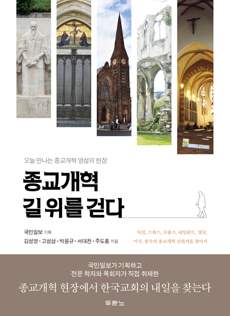 한국교회가 2017년 종교개혁 500년을 전환점으로 과연 변화의 물꼬를 틀 수 있을까요. 언제나 그랬지만 그것은 하나님의 손에 달려 있을 것입니다. 세계교회 역사가 이를 방증합니다. 국민일보는 2016년 5월부터 2017년 6월까지 1년간 ‘영성의 현장을 찾아서’란 제목으로 5부작 55회에 걸쳐 종교개혁 500주년 시리즈를 연재했습니다. 종교개혁의 불길이 어떻게 세상에 영향을 끼쳤고 성령 하나님의 역사는 어떻게 독일에서 유럽으로, 유럽에서 미국으로, 그리고 한반도까지 전해졌는지, 그리고 이 한국 땅에서 어떻게 개혁 정신이 꺼지지 않고 타올랐는지 그 현장을 돌아봤습니다. 신학자와 목회자로 구성된 5명의 필자가 참여해 종교개혁의 발상지인 독일과 스위스, 프랑스와 영국, 미국과 한국 땅 곳곳을 방문해 역사의 현장을 추적하면서 한국교회 갱신을 위한 해답을 찾고자 했습니다. 이 책은 단순히 500년 전 종교개혁 현장을 탐방한 보고서가 아닙니다. 역사적 장소에서 오늘의 한국교회의 현실을 냉철하게 평가하고 가야 할 길을 하나씩 제시한 이 시대의 의제이기도 합니다. 특히 필자들의 노력으로 그동안 한국교회에는 다소 생소했던 인물이나 장소, 사실 관계 등을 새롭게 조명할 수 있었다는 점에서 이 책은 단순히 종교개혁을 기념하는 도서 이상의 의미를 가집니다. 독자들은 페이지를 넘길 때마다 이를 발견할 수 있을 것입니다. …한국교회는 기념하는 일에 관심이 많습니다. ‘기념만 한다’는 지적을 받는 것도 사실이지만 옛적 일을 다시 기억하는 것이 흩어진 마음을 다잡는 기회가 되기도 합니다. 바라기는 이 책이 다시 한 번 우리의 마음과 생각, 행동을 살려내는 촉매제가 되기를 기도합니다.