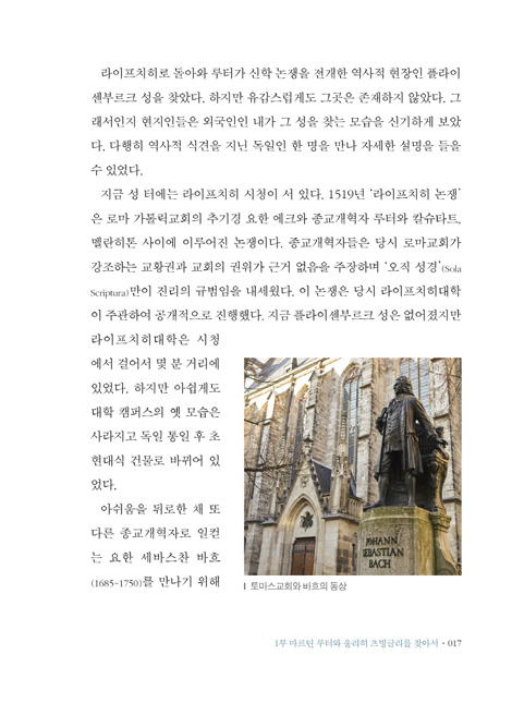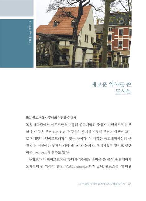 새로운 역사를 쓴 도시들|95개조 반박문이 걸린 비텐베르크 성 교회|루터의 도시 비텐베르크|500년 전 종교개혁의 소리를 따라 독일교회로|비텐베르크에서 만난 멜란히톤의 발자취|공개 신학 논쟁의 중심지 라이프치히|루터의 은신처 바르트부르크 성|루터의 생애가 스며 있는 아이스레벤|새로운 종교개혁의 중심지 그로스뮌스터교회|츠빙글리의 누추한 생가