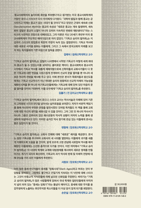 종교사회학자인 로드니 스타크는 이천 년 기독교 역사를 “역사적이고 사회학적인” 관점에서 다룬다. 그는 기독교에 대한 부정적 신념이 팽배하고 근거 없는 비난이 난무하는 현대 사회에서 간과되기 쉬운 측면, 즉 기독교가 인류문명에 가져온 공헌에 초점을 맞춘다. ··· 이미 많은 중세 연구자들이 중세를 “암흑시대”(Dark Ages)라고 부르는 것이 부당함을 밝혀왔다. 그럼에도 불구하고 끈질기게 지속되는 이 낙인에 대해 저자는 그것이 반종교적 지식인들에 의해 날조된 신화임을 주장한다. 바라기는 기독교 승리의 발자취가 많은 사람들에게 읽혀서 국내 학계와 일반인들에게 아직까지 널리 퍼져있는 “중세는 암흑기”라는 통념이 깨어지고, 중세에 대한 무지를 용감무쌍하게 노출하는 후안무치한 목소리들을 더 이상 듣지 않게 되기를 희망한다. 아울러 번역서임에도 돋보이는 유려한 문체가 독서의 기쁨을 더하리라 확신한다.