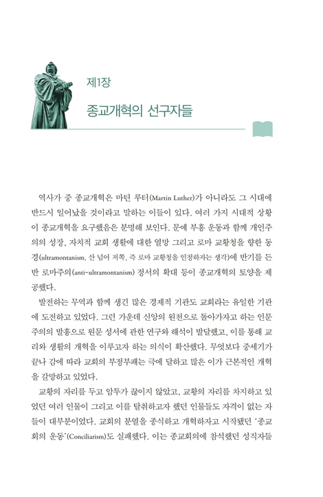 역사가 중 종교개혁은 마틴 루터(Martin Luther)가 아니라도 그 시대에 반드시 일어났을 것이라고 말하는 이들이 있다. 여러 가지 시대적 상황이 종교개혁을 요구했음은 분명해 보인다. 문예 부흥 운동과 함께 개인주의의 성장, 자치적 교회 생활에 대한 열망 그리고 로마 교황청을 향한 동경(ultramontanism, 산 넘어 저쪽, 즉 로마 교황청을 인정하자는 생각)에 반기를 든 반 로마주의(anti-ultramontanism) 정서의 확대 등이 종교개혁의 토양을 제공했다. p. 18