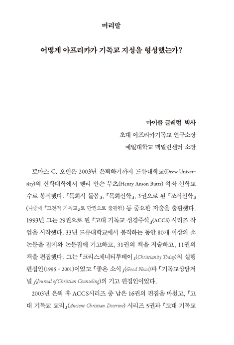 이 책은 어떻게 아프리카가 초대 기독교 지성을 형성하는 데 있어서 주요한 역할을 했으며 서구 기독교의 모판이 되었는지 집중 조명하여 부각시켜 줌으로써 기독교 이해에 있어서 서구 중심의 제국주의적 시각에서 벗어나서 본래적인 이해를 회복하도록 도와준다.
