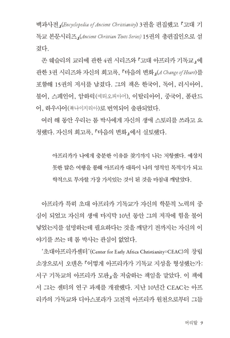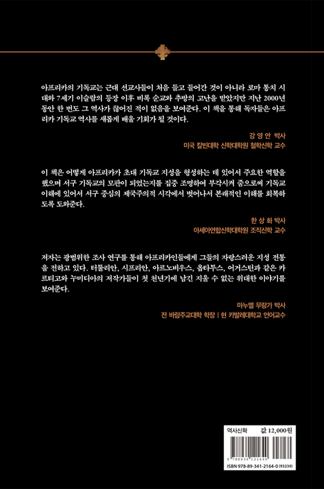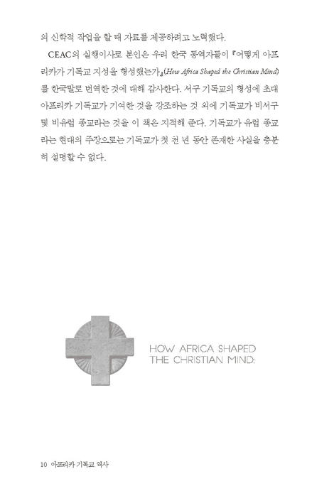 본서는 어떻게 아프리카가 초대 기독교 지성을 형성하는데 중요한 역할을 했으며 서구 기독교의 모판이 되었는지 집중 조명한다. 이와 함께 기독교를 서구 중심의 제국주의적 시각에서 벗어나서 본래적인 이해를 회복하도록 도와준다. 아프리카의 정체성과 기독교 역사에 특별히 관심을 갖는 독자들에게 이 책을 적극 추천하는 바이다.
