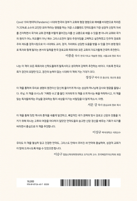 Covid 19의 펜데믹(Pandemic) 시대에 한국의 정부가 교회에 행정 명령으로 예배를 비대면으로 하라든가 20%로 소수의 교인만 모여 하라는 명령을 하는 지금 스코틀랜드 언약도들의 가장 성경적 신앙적 자세를 견지하면서 국가와 교회 관계를 어떻게 끌어갔는지를 산 교훈으로 배울 수 있을 뿐 아니라 교회와 국가의 원리가 어느 피조물이 아닌 예수 그리스도만이 절대 주권자임을 고백하고 실천하였고 민주적 장로회주의 제도를 정착시킴으로 이 시대에도 교리, 정치, 치리에도 상당한 도움을 받을 수 있을 것이 분명함으로 독자와 함께 필자는 본서의 일독을 한국 장로교회 목회자와 모든 교회의 지도자들께 간곡히 추천한다.