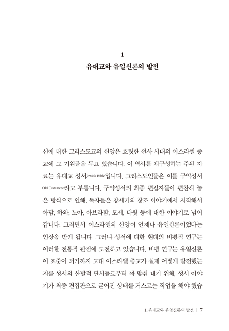 다시 말해, 유대교-그리스도교가 신을 인식한 방식을 ‘역사주의적으로’ 제시한다. 하나의 고정된·일관된 신 이해 방식을 따르지 않고, 신에 대한 인식이 시대에 따라 어떤 사건 및 흐름과 상호 작용하며, 어떤 내용으로 변천해 왔는지를 통찰력 있게 기술한다.