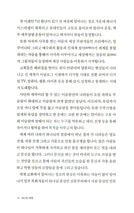 말세의 크리스천은 참으로 깨어 있어야 합니다. 혹시 주님의 사람으로 예비되지 못했다면 바로 오늘 이 시간 회개하고 준비해야 합니다. “조금 있다가 하지”, “내일부터 하지”라고 미루지 마십시오. 오늘만이 준비할 수 있는 시간입니다. 내일은 예수 그리스도의 공중 강림과 환난이 시작 됩니다.